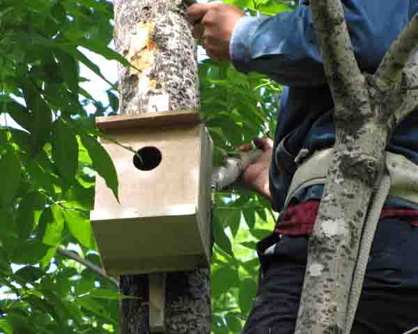 黑龙江省哈尔滨市延寿县人工林面积较大,主要树种是落叶松和杨树,因此,落叶松毛虫和杨树食叶害虫每年都有发生,是该县人工林的主要害虫,严重威胁着人工林的健康生长,由于部分林地受到地形复杂、地势较高、林龄较大、郁闭较差、水源缺乏等的影响,使放烟和喷雾等防治作业出现诸多困难,为此,延寿县积极开展挂鸟箱招引益鸟进行防治。为达到提高招引率,控制害虫蔓延,长久利用,维护生态平衡之目的,该县从三个方面着手,积极做好悬挂鸟箱的各项工作:一是2015年2月末前,各防治单位要在2014年调查的基础上,根据发生程度、地形地势、发生面积等确定悬挂鸟箱的林分及悬挂鸟箱的数量;二是2015年3月末前,各防治单位要根据平时积累和资料记载,确定防治林分内益鸟的种类,最后确定悬挂鸟箱的规格大小,积极开展并完成鸟箱的制作;三是2015年4月中旬前,各防治单位组织人员、准备悬挂工具,全面开展并完成鸟箱悬挂工作。